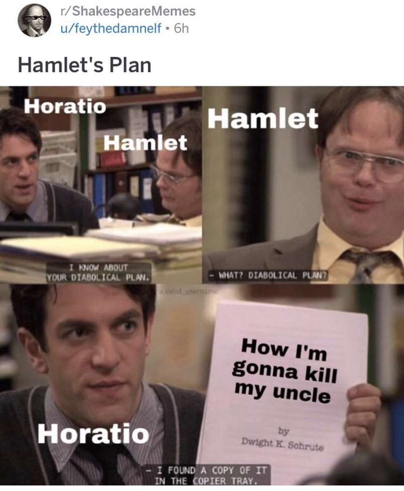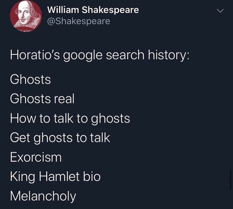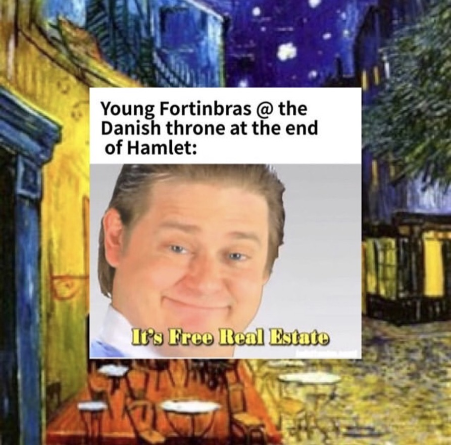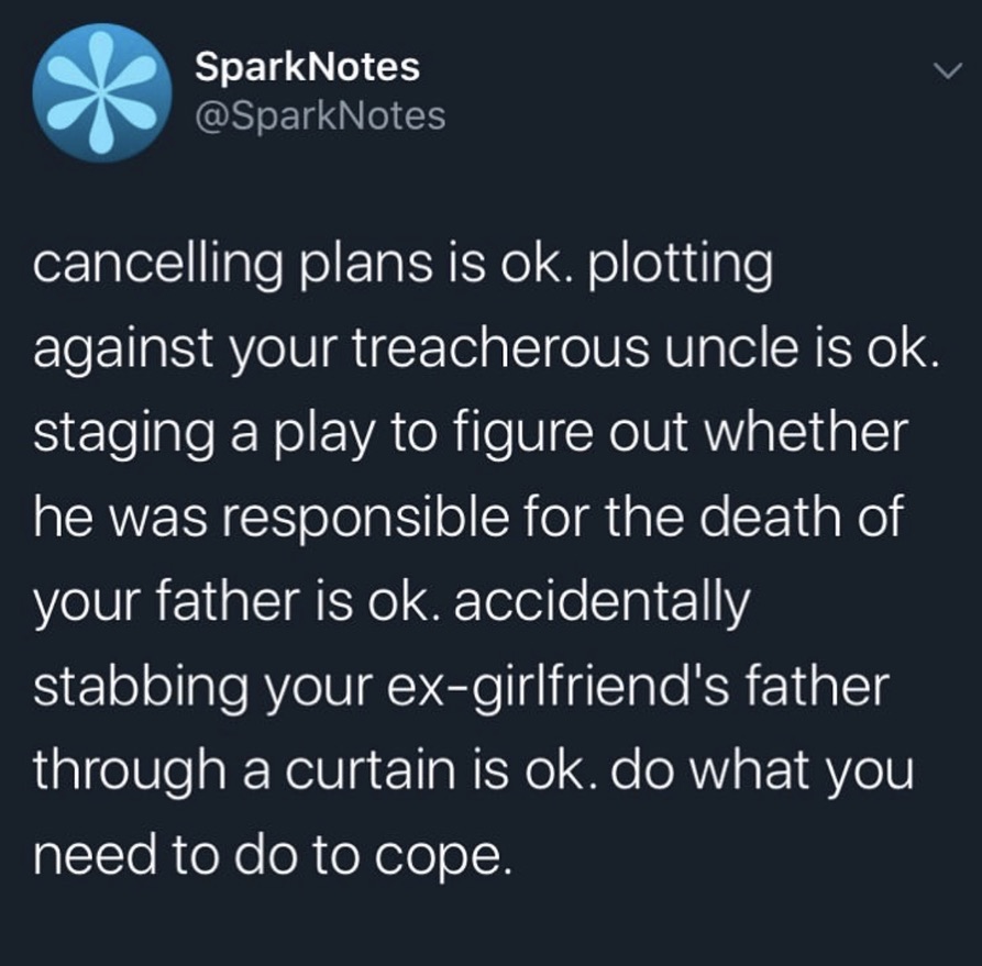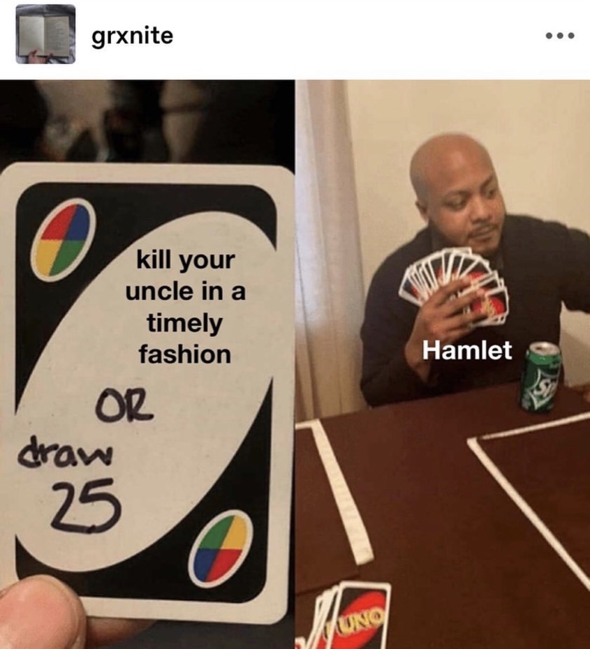 I really fell in love with Ophelia, like I understand that suicide is never the answer bla bla bla. But how cool, your ex boyfriend thinks he’s all edgy talking about killing himself but he’s too much of a pu- wait. Too much of a wimp! To do it himself! And Ophelia is like you know what! I’m gonna do it! She was so brave and she didn’t need a man controlling her anymore. Not her father, not her brother, and sure as heck not Hamlet. It teaches how being constantly controlled (by a man, government or even a lover) is no way to live a life but she didn’t just kill herself to be free from the chains, she killed herself as an act of defiance and protest of the situation she was in, and many other people are in. This doesn’t teach ah yes your life is hard? Commit suicide. But more so it teaches to act when a situation has risen and in her time it was illegal to commit suicide, it fit for her to do that. She had one last horrah and it was her decision and she followed through. Speaking of following through, Hamlet was all talk. Now I’m not gonna bash too much on Ham here because I also liked him and I related to him cuz I’m also all talk, I rarely follow through, and I pretend I’m emo and edgy but I’m really a baby. Any how Hamlet constantly planning and talking out his revenge plan is his whole downfall, it really teaches how you have to act before it’s too late. It could be as subtle as telling the boy you like him before he moves away to being a pretty big deal like killing your uncle. It is also very frustrating because Hamlet is obviously smart and cunning. With his jabs at various characters (Polonius) and his quick thinking when he was sent off to England. Even though Hamlet is so smart he was not wise. When his opportunity arose to kill his uncle he did not take it because his uncle was asking for forgiveness, but if Hamlet would have just waiting a little longer he would have heard his uncle say that he doesn’t feel it in his soul. But alas the play would have been over and there would be no lesson to be had if Hamlet were actually smart.